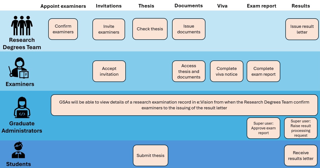 The diagram below illustrates the scope of the new functionality by each major process area, starting with the Research Degrees Team receiving an approved Appointment for Examiners application (GS03), up until a student receives their results letter. It also highlights the different tasks each user will undertake while using the system: